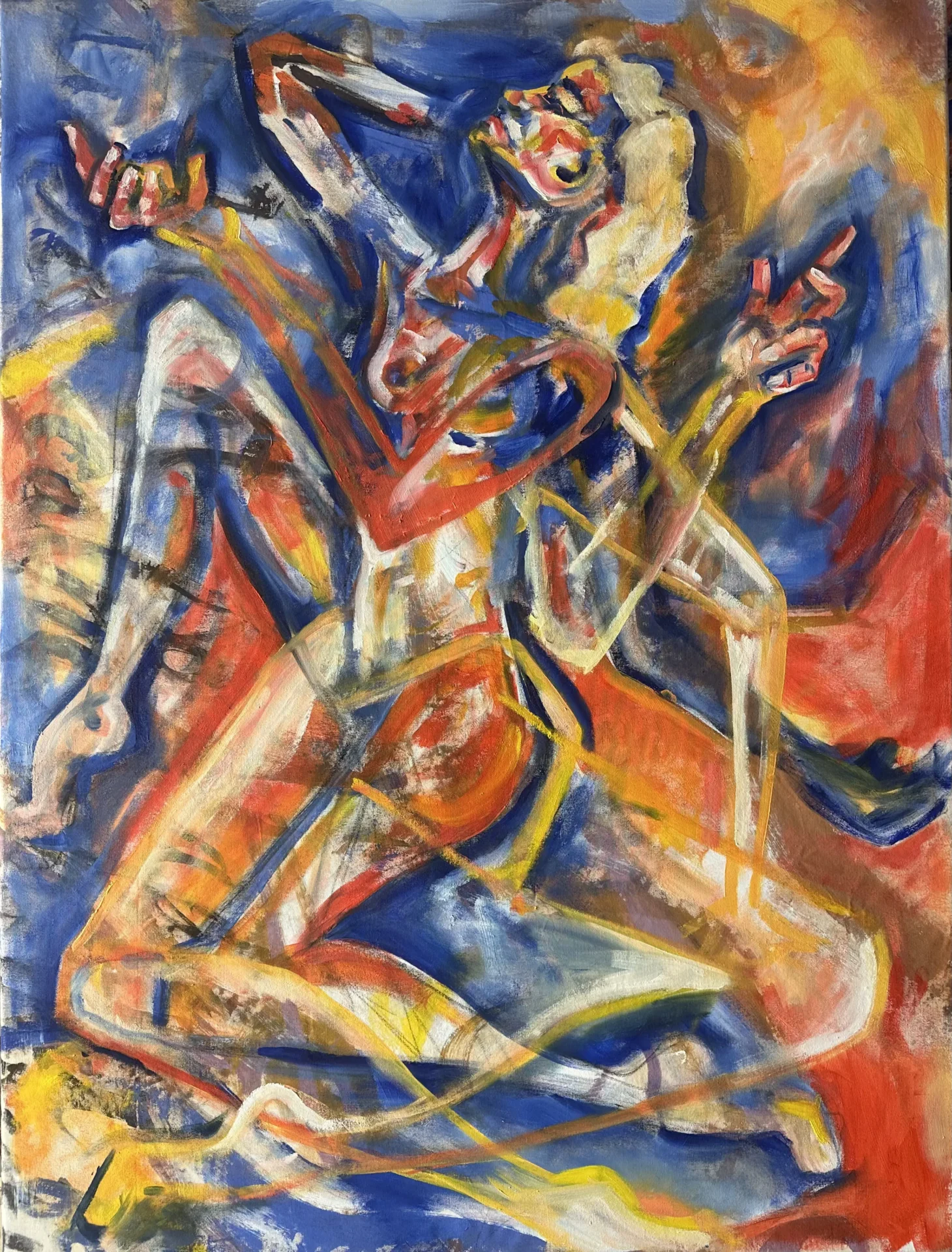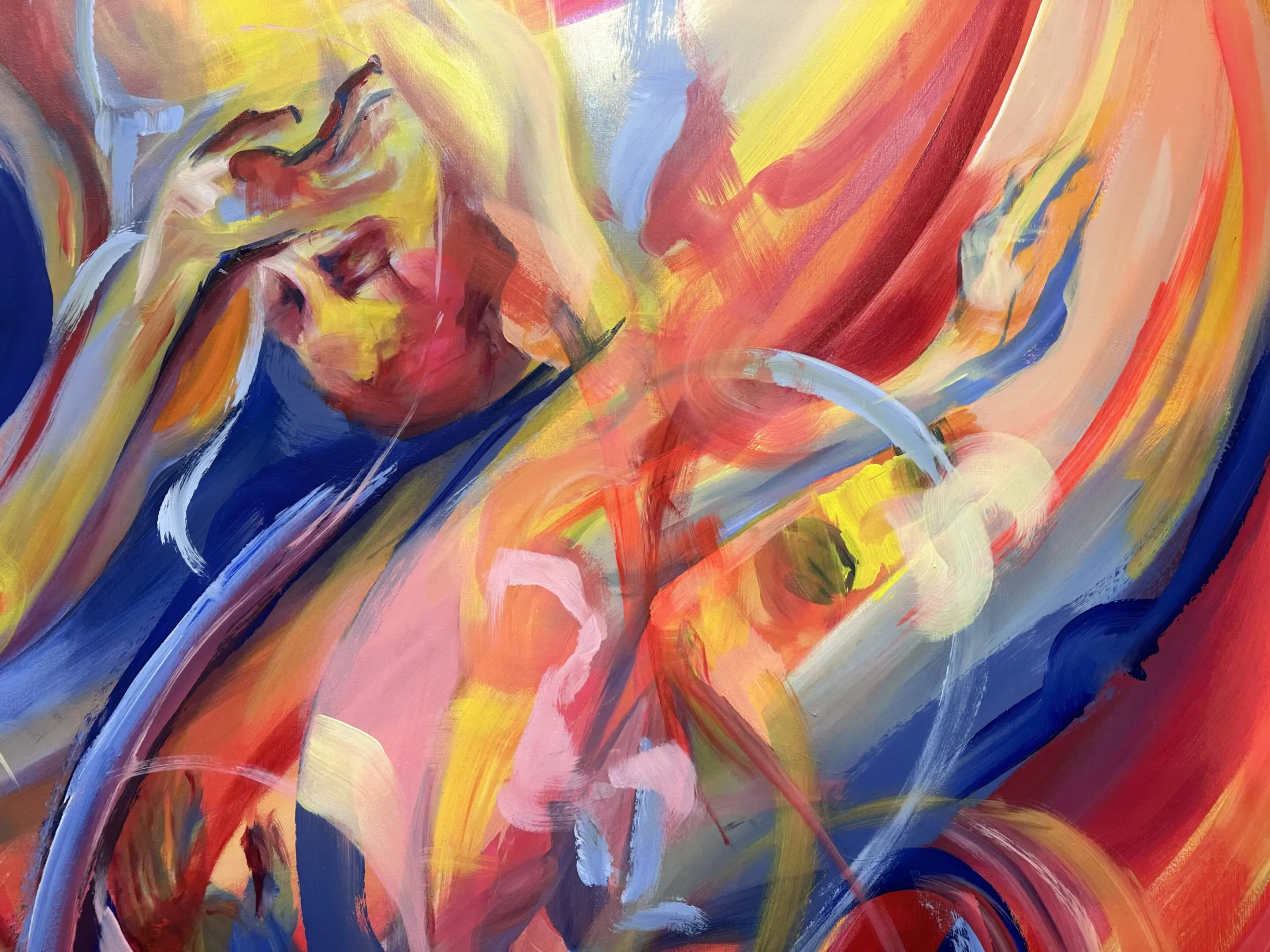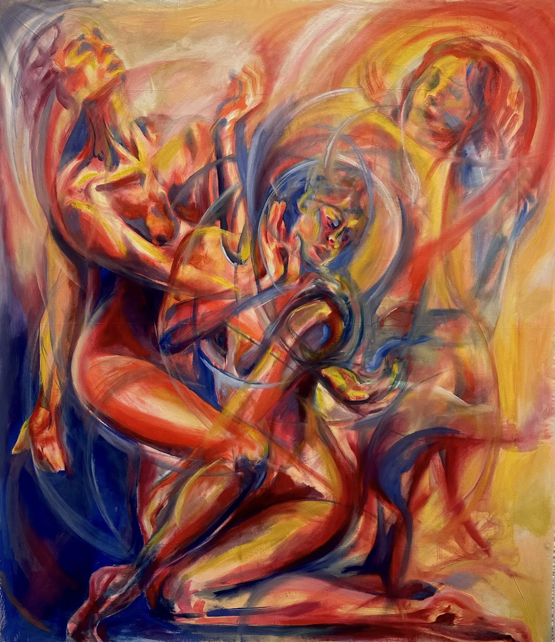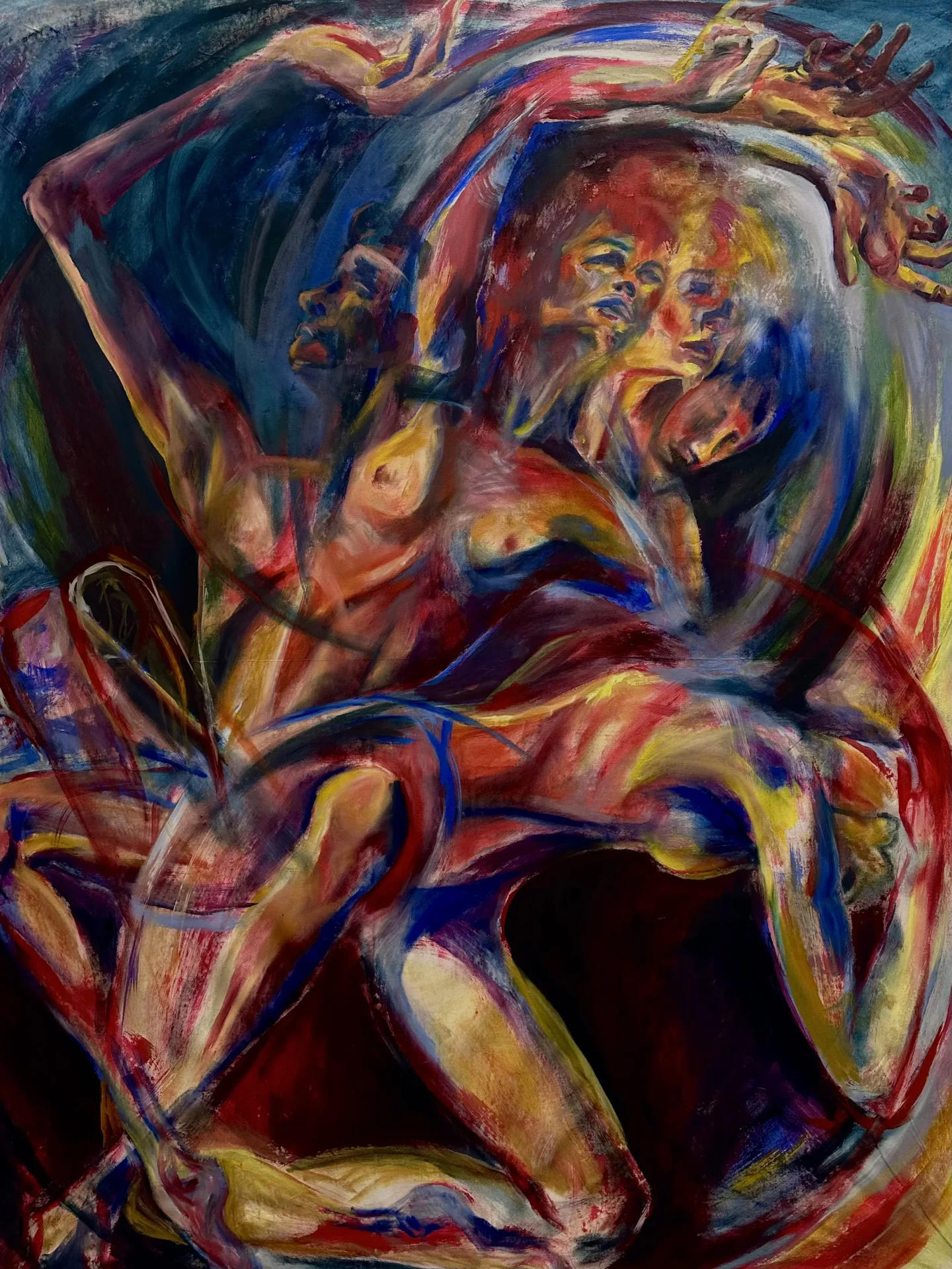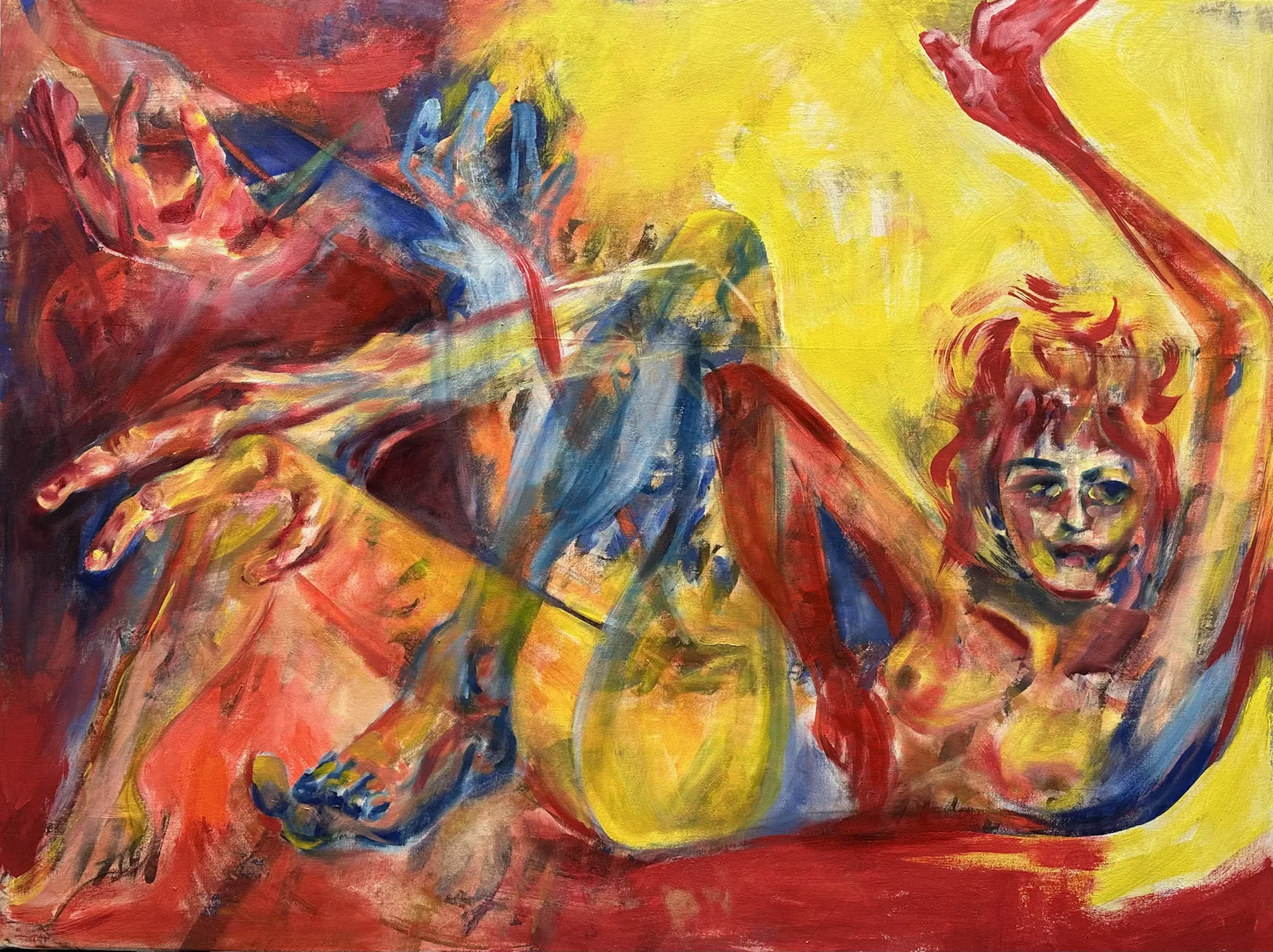 Using oil paint, I strive to capture the form of a body while still encapsulating the lightness that occurs when a figure is in motion. I use bold primary colors softened by transitional hues that overlap and intertwine, creating a pulsing, energetic rhythm across the canvas. Many of my subjects appear as layered or sequential figures, revealing movement over time. These subjects are influenced by dancers and their dedication to moving their bodies to the fullest extent. Not in ways of hypermobility, but a true understanding of the energy and potential behind moving in space. I often paint self-portraits that try to embody this experience of deeply knowing one's physical self aligned with the mental. Displaying such a personally diverse and internal experience onto a canvas excels me to push the boundaries of what I make.