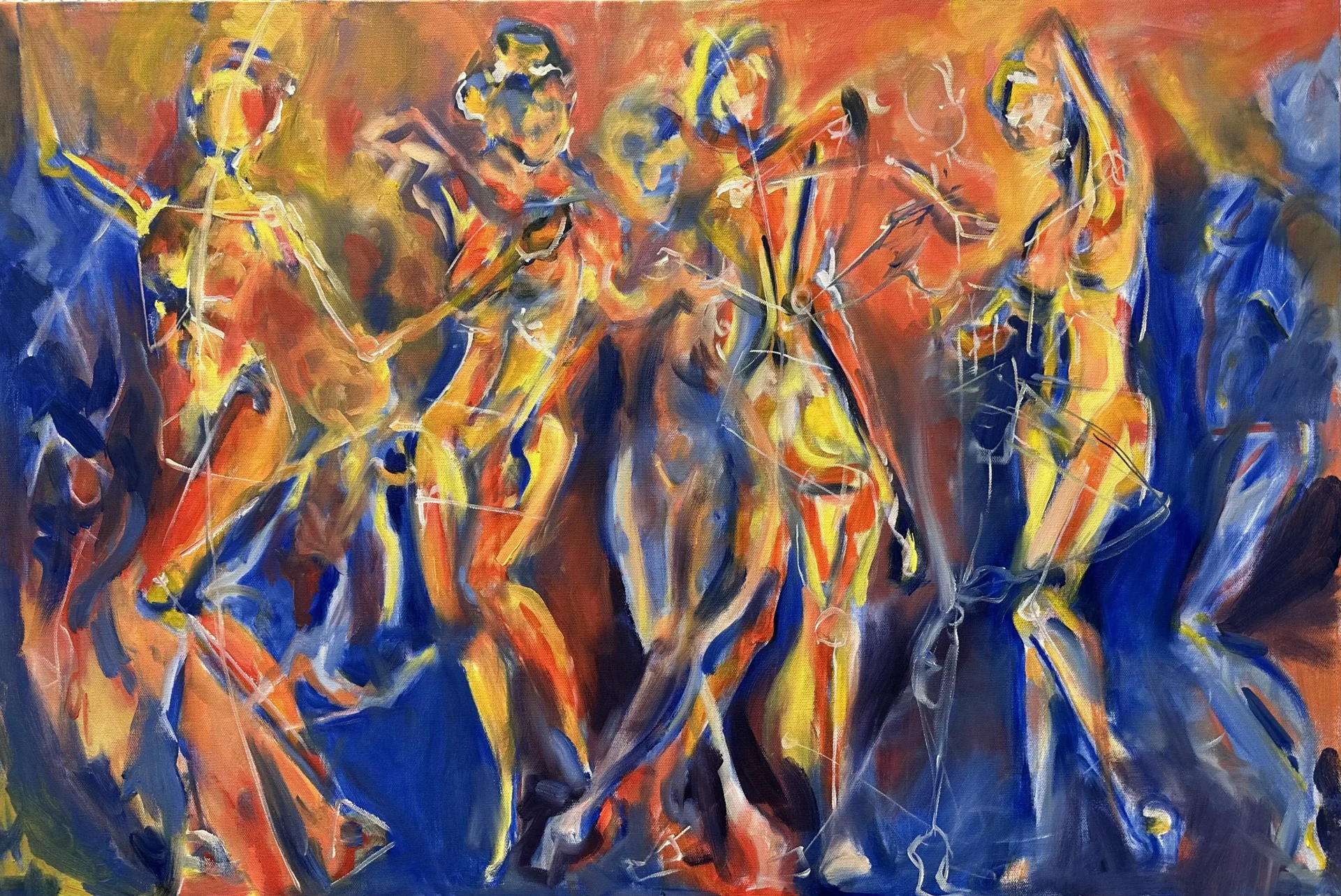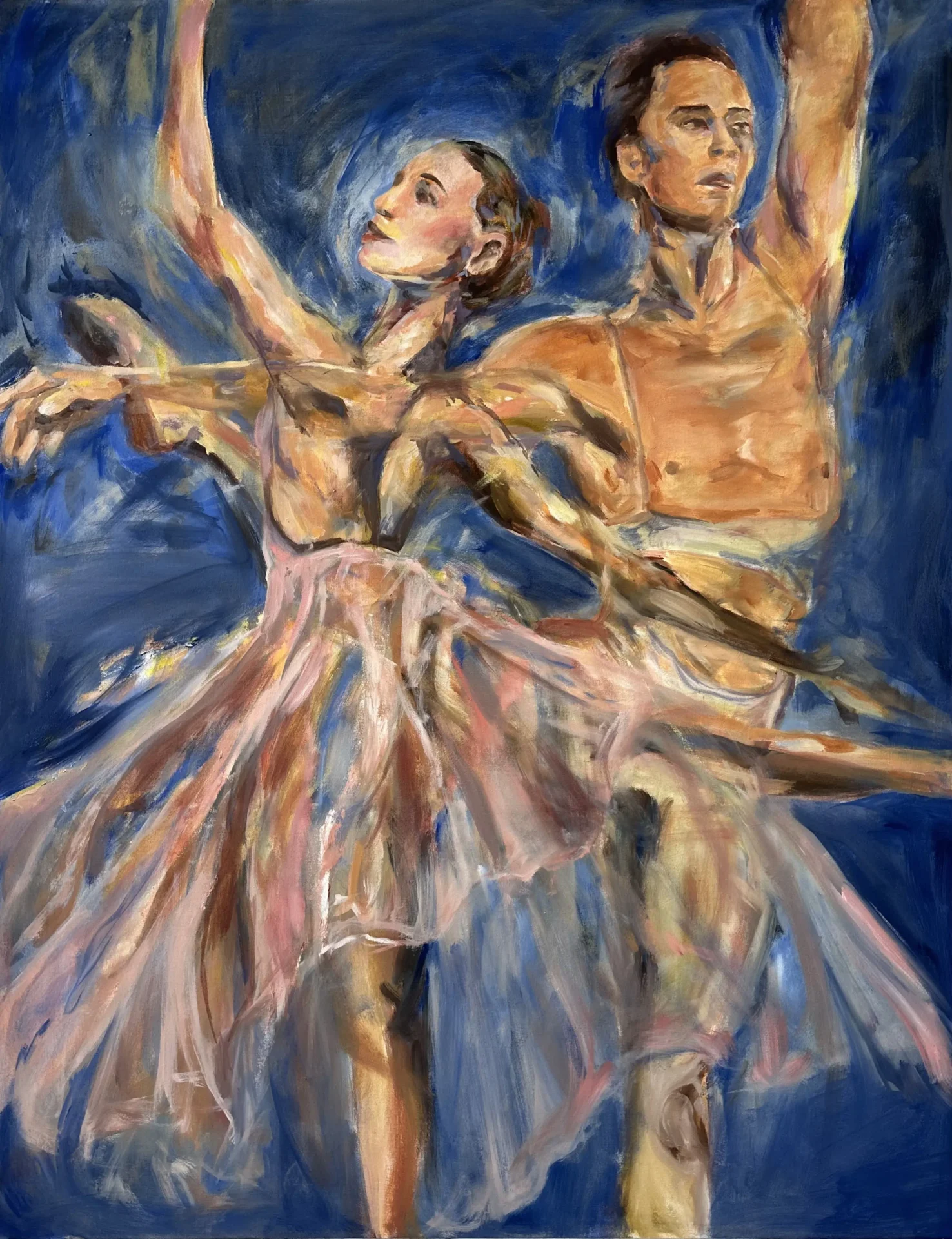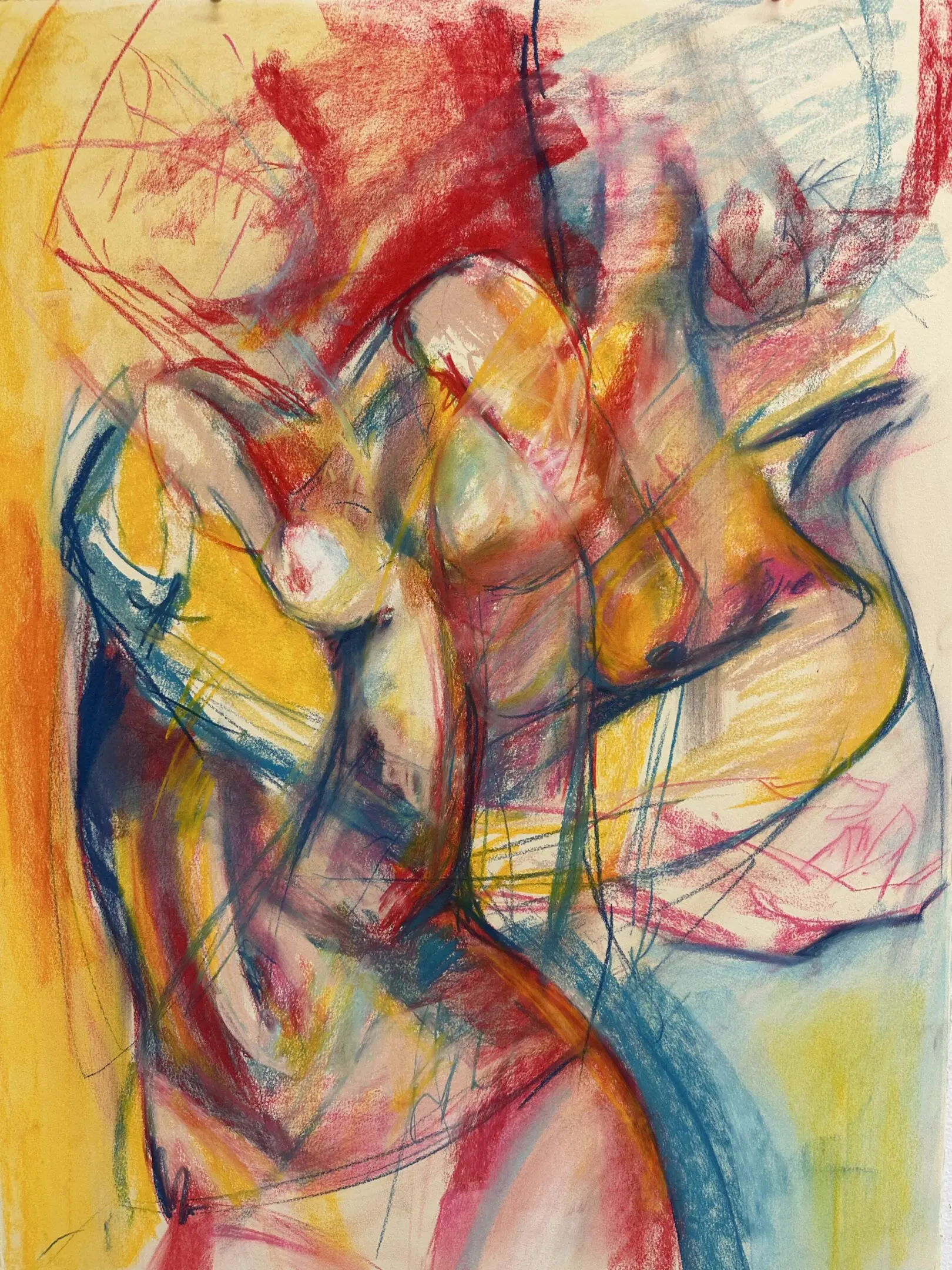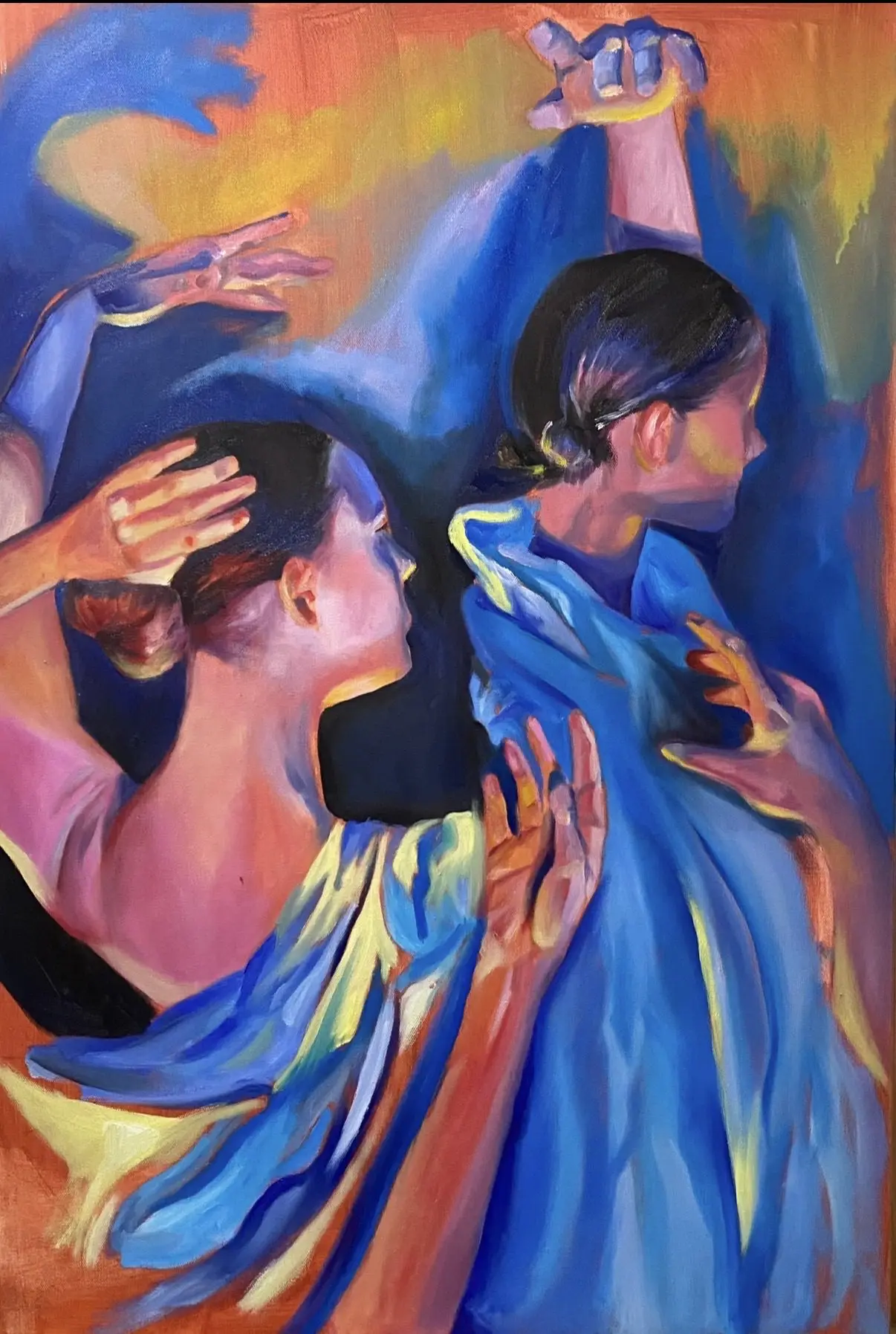 Using oil paint, I strive to capture the form of a body while still encapsulating the lightness that occurs when a figure is in motion. I use bold primary colors softened by transitional hues that overlap and intertwine, creating a pulsing, energetic rhythm across the canvas. Many of my subjects appear as layered or sequential figures, revealing movement over time. These subjects are influenced by dancers and their dedication to moving their bodies to the fullest extent. Not in ways of hypermobility, but a true understanding of the energy and potential behind moving in space. I often paint self-portraits that try to embody this experience of deeply knowing one's physical self aligned with the mental. Displaying such a personally diverse and internal experience onto a canvas excels me to push the boundaries of what I make.