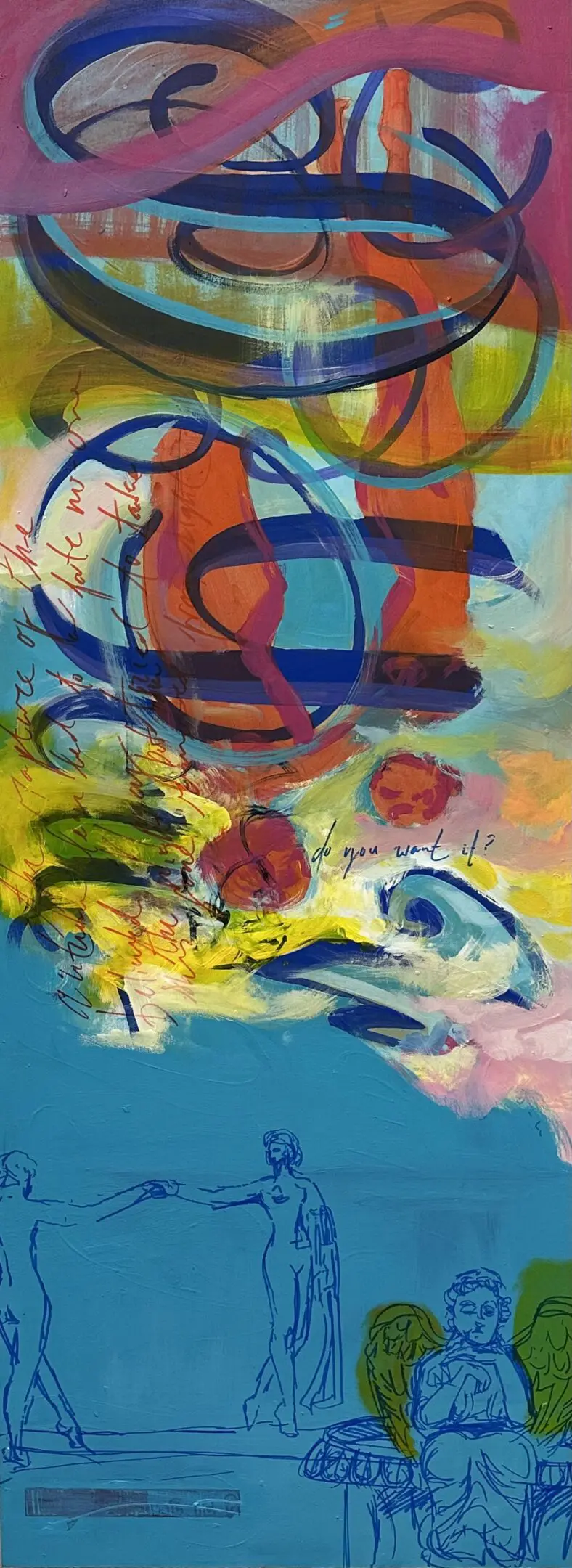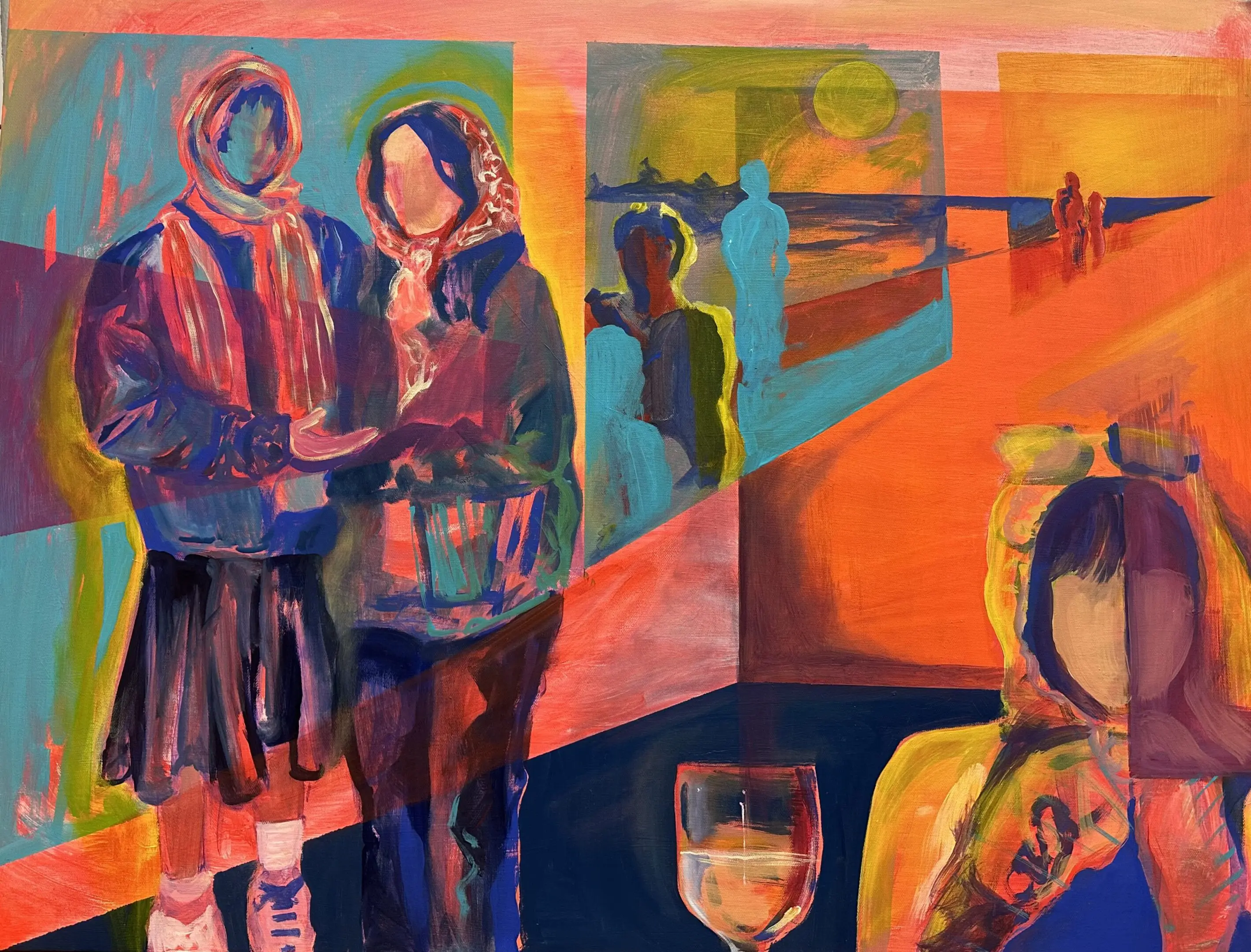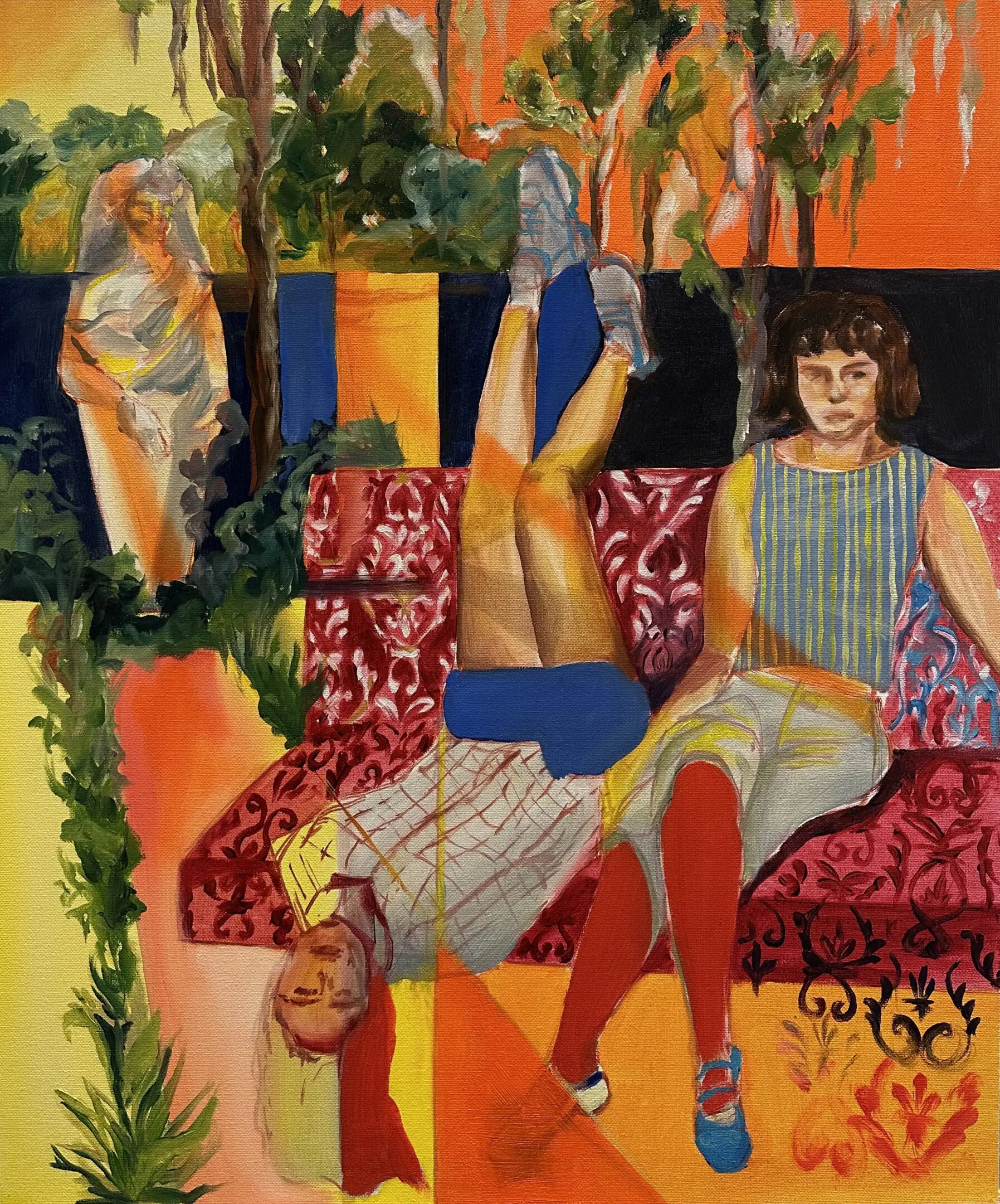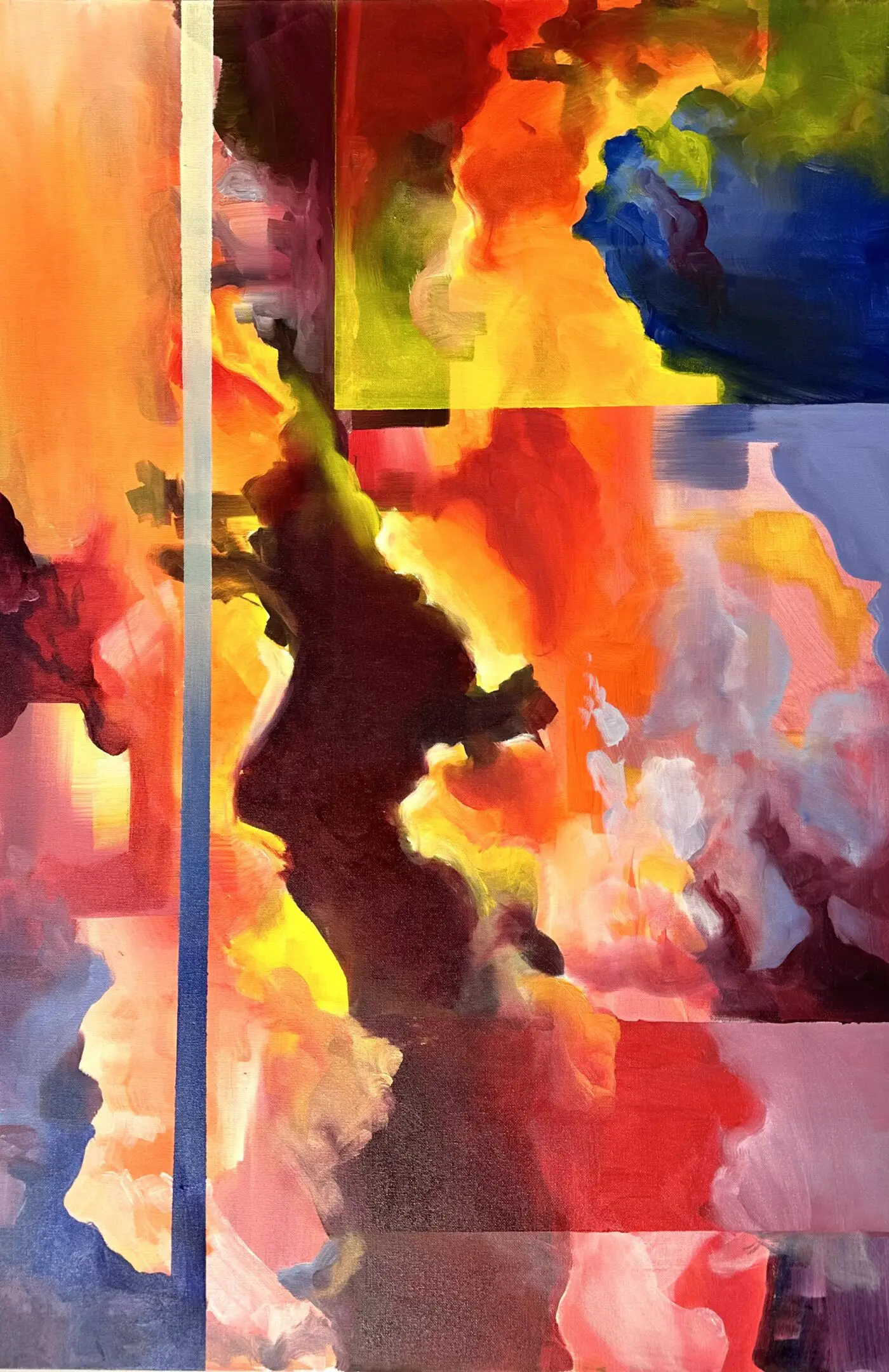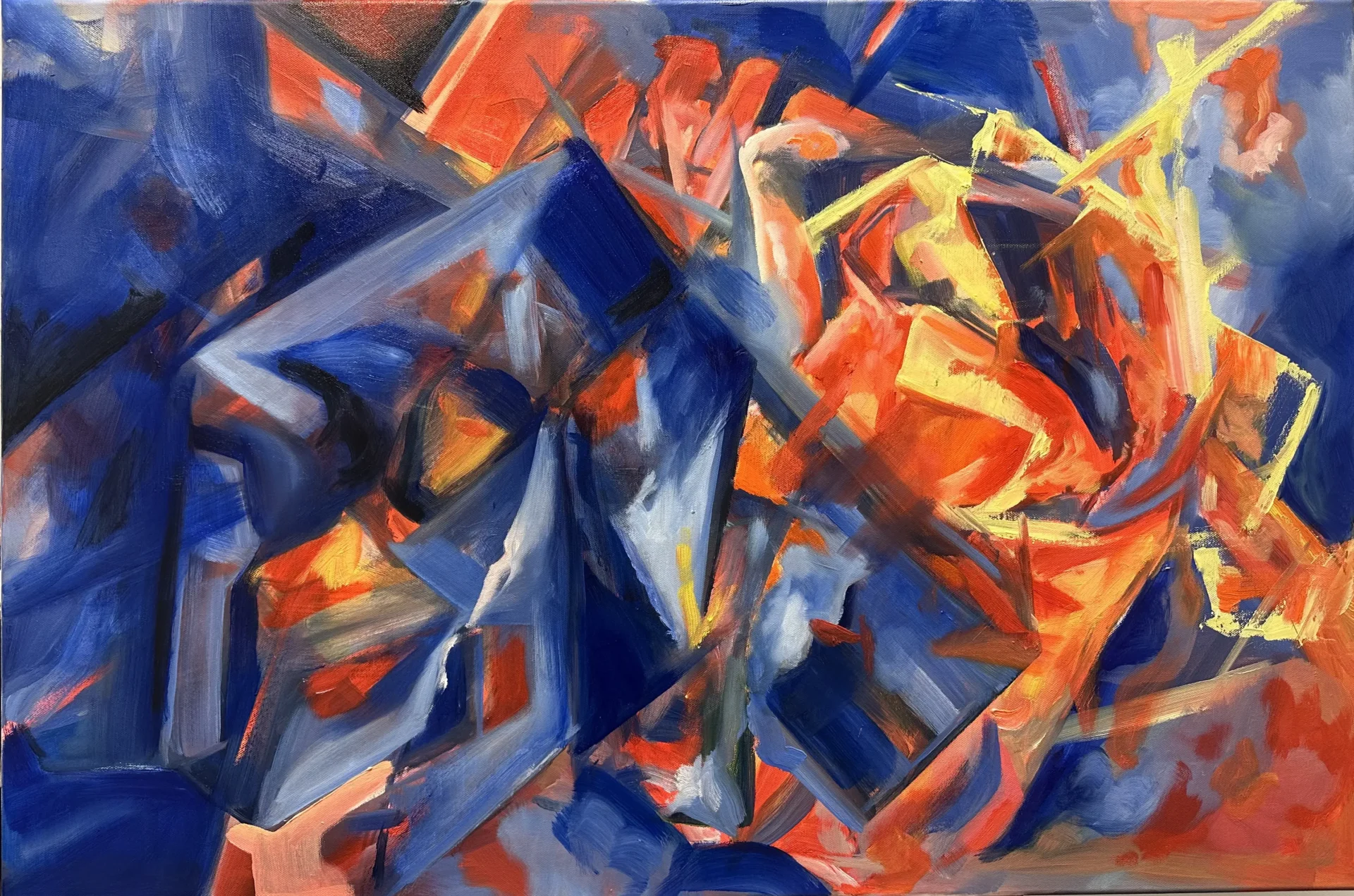 Using oil paint, I strive to capture the form of a body while still encapsulating the lightness that occurs when a figure is in motion. I use bold primary colors softened by transitional hues that overlap and intertwine, creating a pulsing, energetic rhythm across the canvas. Many of my subjects appear as layered or sequential figures, revealing movement over time. These subjects are influenced by dancers and their dedication to moving their bodies to the fullest extent. Not in ways of hypermobility, but a true understanding of the energy and potential behind moving in space. I often paint self-portraits that try to embody this experience of deeply knowing one's physical self aligned with the mental. Displaying such a personally diverse and internal experience onto a canvas excels me to push the boundaries of what I make.