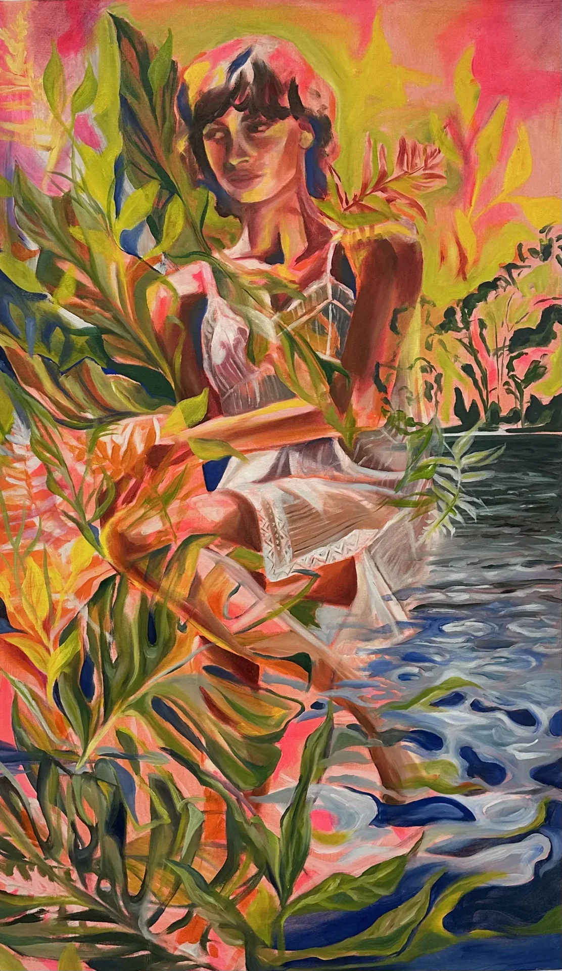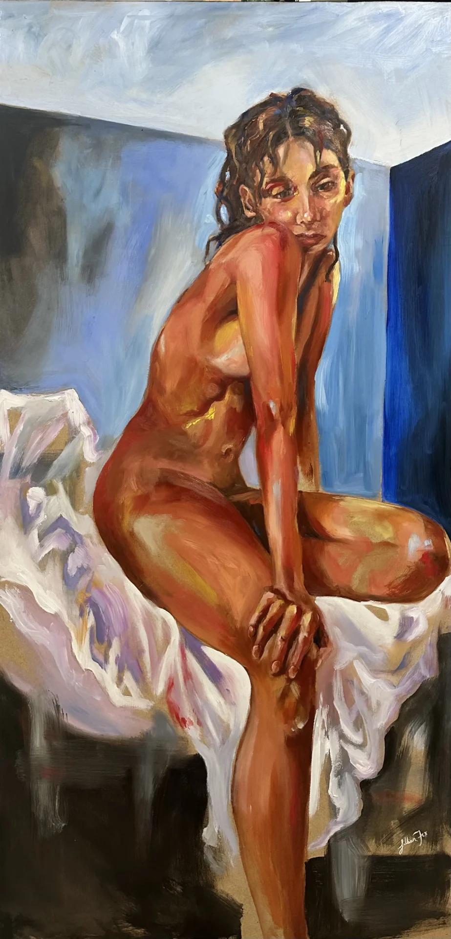 Alone within myself, creating artwork for me-that's where it begins. Within my painting is the place I feel true confidence, as a person and as an artist. I don't overthink a single stroke; I let the perspective imprinted in my mind transcend onto the canvas. Painting is innate within me, and I feel called to create. Working primarily in oil paint, I focus on large-scale figurative pieces that meld abstraction with representation. When I'm creating these works, I allow my whole arm and body to move, with my paintbrush as an extension. I want the brushstrokes to convey the mentality that I feel when creating: free and somewhat disorderly. My pieces focus on fleeting moments, the vulnerable emotions shown on one's face and through their movements, something that you can only trace a glimpse of if you are searching for it.